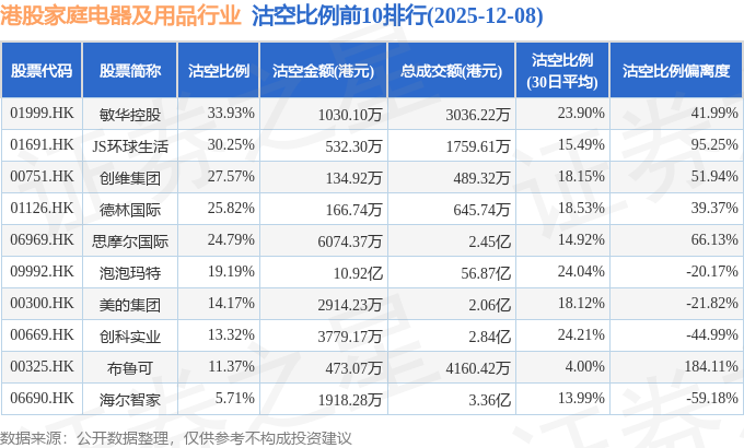 从沽空比例来看,敏华控股、JS环球生活、创维集团沽空比例位居行业前三,分别为33.93%、30.25%、27.57%。